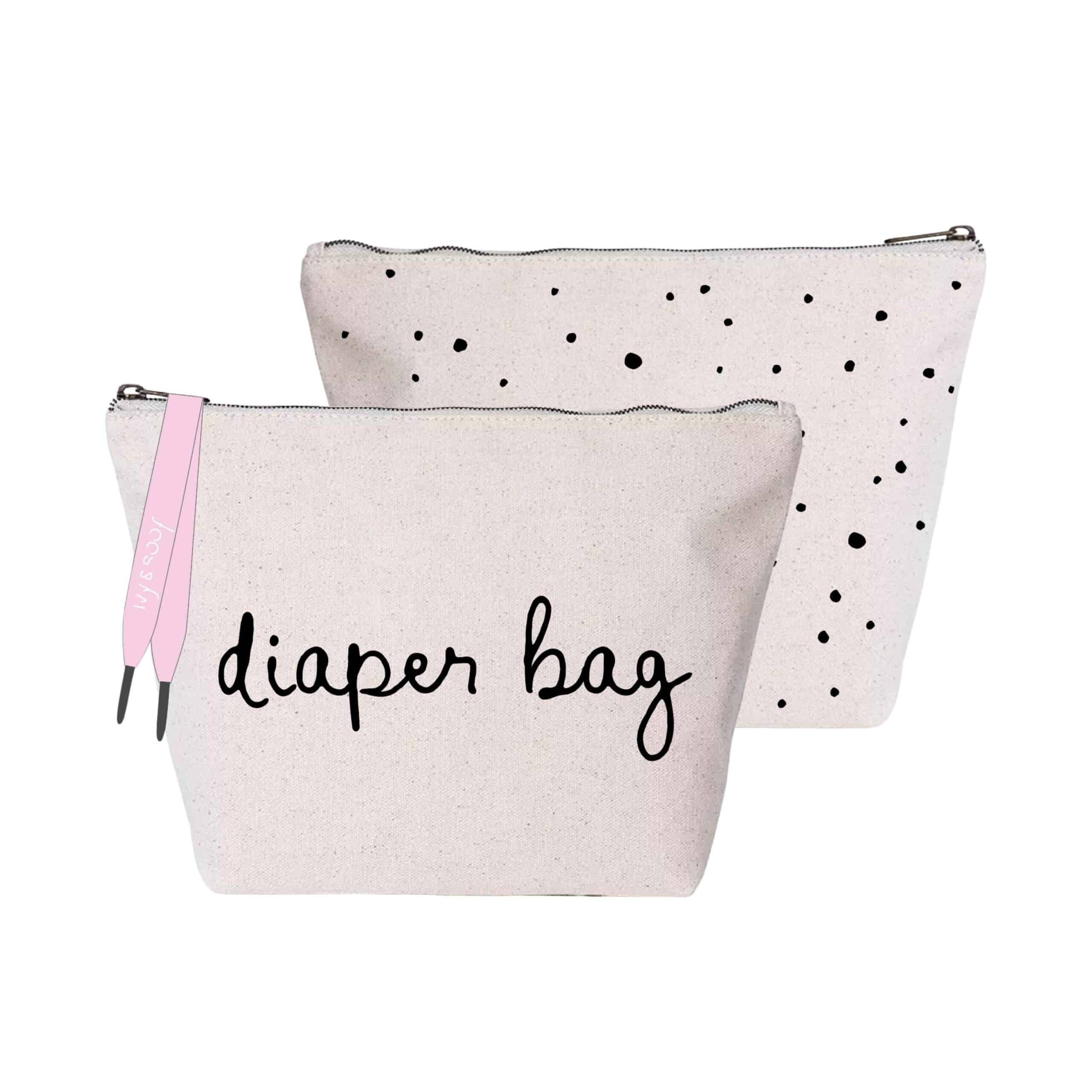 Deze luieretui met de tekst ‘diaper bag’ én stipjes is speciaal voor alle spulletjes die je nodig hebt wanneer je met je kindje op stap gaat. In deze etui kan je gemakkelijk producten opbergen zoals luiers, billendoekjes, billencreme en nog veel meer. Deze diaperbag is te gebruiken als luiertas organizer, op deze manier liggen de spullen voor het verschonen van je kindje niet los in de luiertas maar zit alles netjes en schoon bij elkaar.