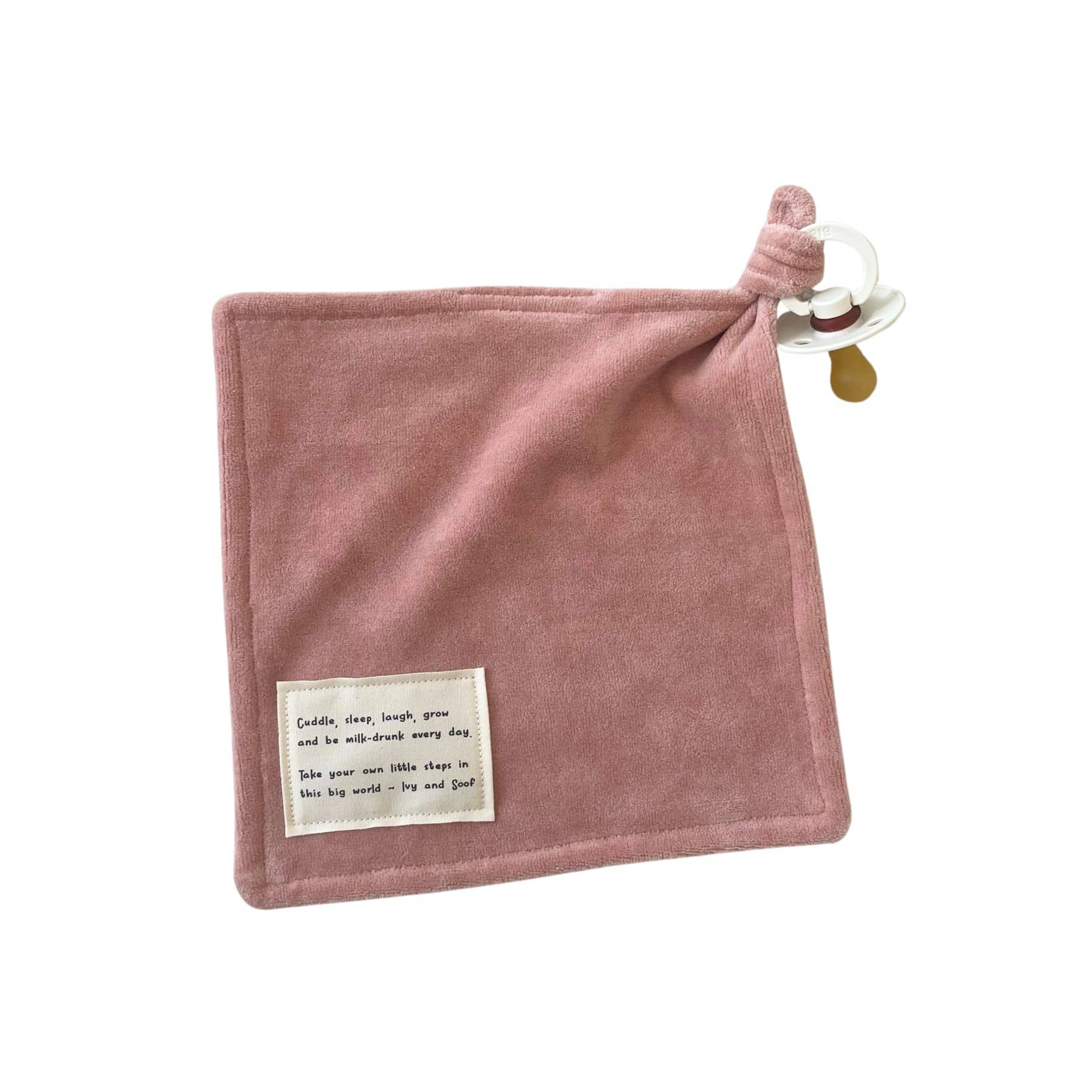 Dit zachte vierkante speendoekje wordt in eigen atelier van Ivy and Soof gemaakt van zacht velours, aan een kant van het doekje zit een lange lus waaraan gemakkelijk elk soort fopspeentje te knopen is. Het doekje is voorzien met een leuk katoenen label.